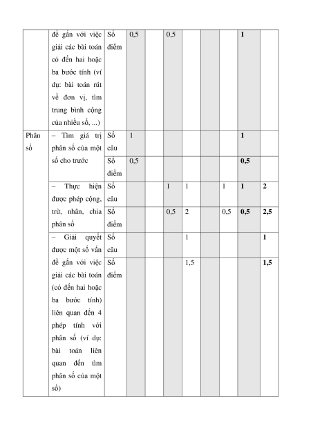 giải các bài toán điểm có đến hai hoặc ba bước tính (ví dụ: bài toán rút về đơn vị, tìm trung bình cộng của nhiều số, ...) Phân – Tìm giá trị Số 1 1 số phân số của một câu số cho trước Số 0,5 0,5 điểm – Thực hiện Số 1 1 1 1 2 được phép cộng, câu trừ, nhân, chia Số 0,5 2 0,5 0,5 2,5 phân số điểm – Giải quyết Số 1 1