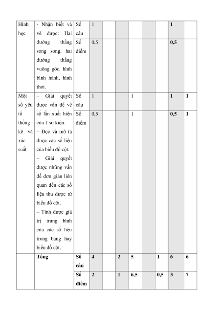 kê và – Đọc và mô tả xác được các số liệu suất của biểu đồ cột. – Giải quyết được những vấn đề đơn giản liên quan đến các số liệu thu được từ biểu đồ cột. – Tính được giá trị trung bình của các số liệu trong bảng hay biểu đồ cột. Tổng Số 4 2 5 1 6 6 câu Số 2 1 6,5 0,5 3 7 điểm