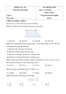 giải các bài toán điểm (có đến hai hoặc ba bước tính) liên quan đến 4 phép tính với phân số (ví dụ: bài toán liên quan đến tìm phân số của một số) Hình - Nhận biết và Số 1 1 học vẽ được: Hai câu đường thẳng Số 0,5 0,5 song song, hai điểm đường thẳng vuông góc, hình bình hành, hình thoi. Một – Giải quyết Số 1 1 1 1
