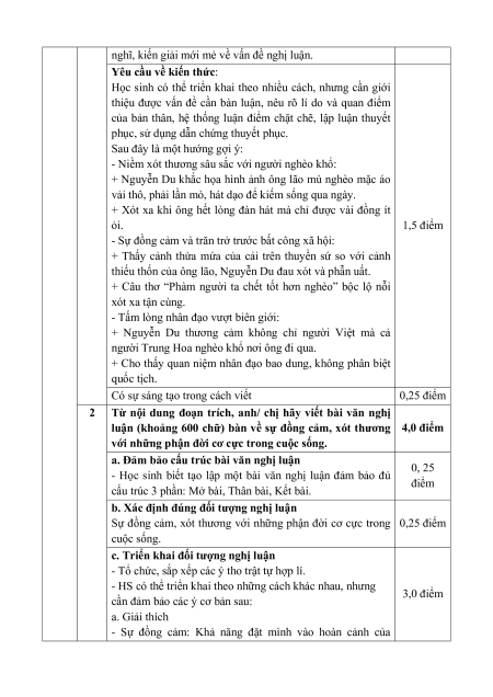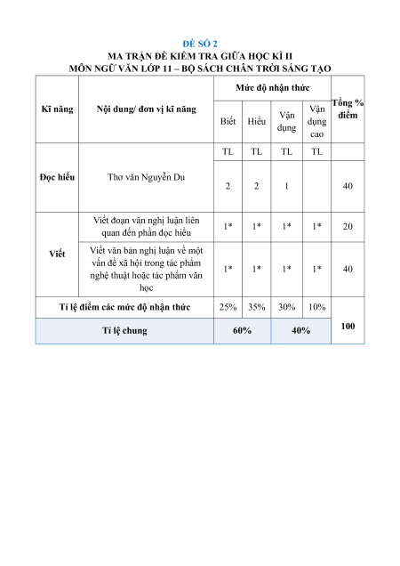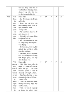 Nội dung/ đơn vị kĩ năng Tổng % Vận điểm Biết Hiểu Vận dụng dụng cao TL TL TL TL Đọc hiểu Thơ văn Nguyễn Du 2 2 1 40