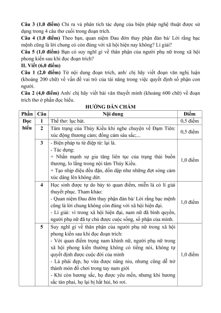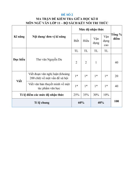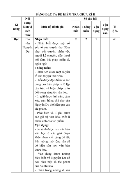 Nội dung/ đơn vị kĩ năng Tổng % Vận điểm Biết Hiểu Vận dụng dụng cao TL TL TL TL Đọc hiểu Thơ văn Nguyễn Du 2 2 1 40