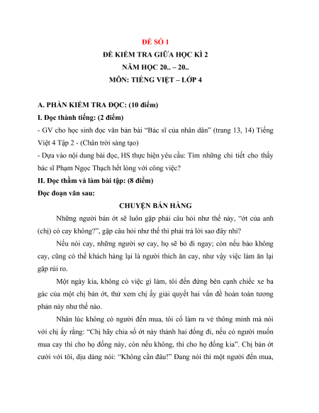 II. Đọc thầm và làm bài tập: (8 điểm) Đọc đoạn văn sau: CHUYỆN BÁN HÀNG