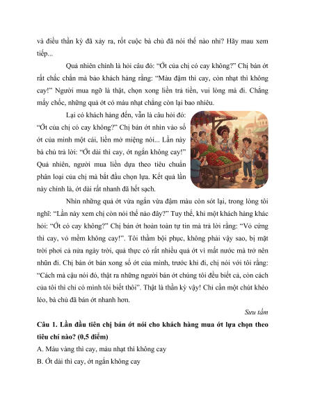 Câu 1. Lần đầu tiên chị bán ớt nói cho khách hàng mua ớt lựa chọn theo tiêu chí nào? (0,5 điểm)