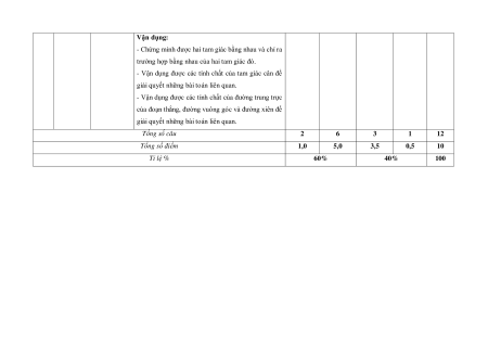 Đường trung trực của một đoạn thẳng 2,0đ 1,0đ Tổng số câu 2 6 3 1 12 Điểm 1,0 5,0 3,5 0,5 10 Tỉ lệ % 60% 40% 100%
