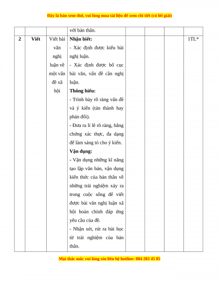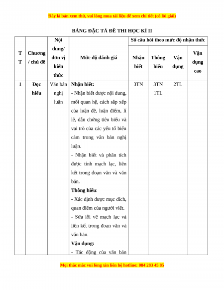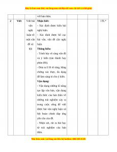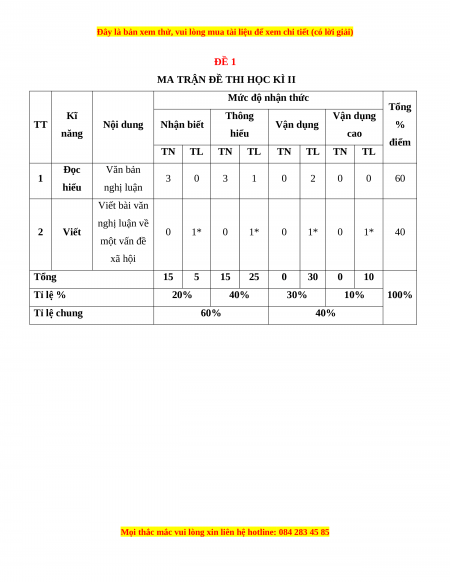 Mức độ nhận thức Tổng Kĩ Thông Vận dụng TT Nội dung Nhận biết Vận dụng % năng hiểu cao điểm TN TL TN TL TN TL TN TL Đọc Văn bản 1 3 0 3 1 0 2 0 0 60 hiểu nghị luận Viết bài văn nghị luận về 2 Viết 0 1* 0 1* 0 1* 0 1* 40 một vấn đề xã hội Tổng 15 5 15 25 0 30 0 10 Tỉ lệ % 20% 40% 30% 10% 100% Tỉ lệ chung 60% 40%