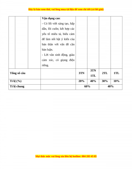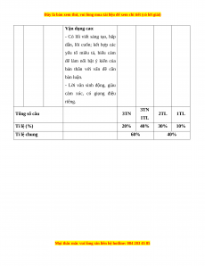 cảm xúc, có giọng điệu riêng. 3TN Tổng số câu 3TN 2TL 1TL 1TL Tỉ lệ (%) 20% 40% 30% 10% Tỉ lệ chung 60% 40%