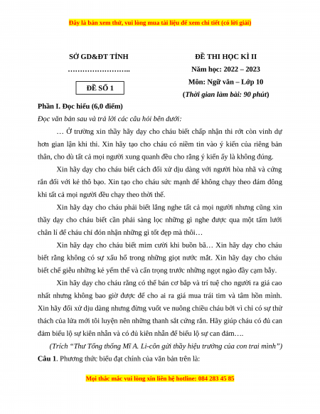Môn: Ngữ văn – Lớp 10 ĐỀ SỐ 1