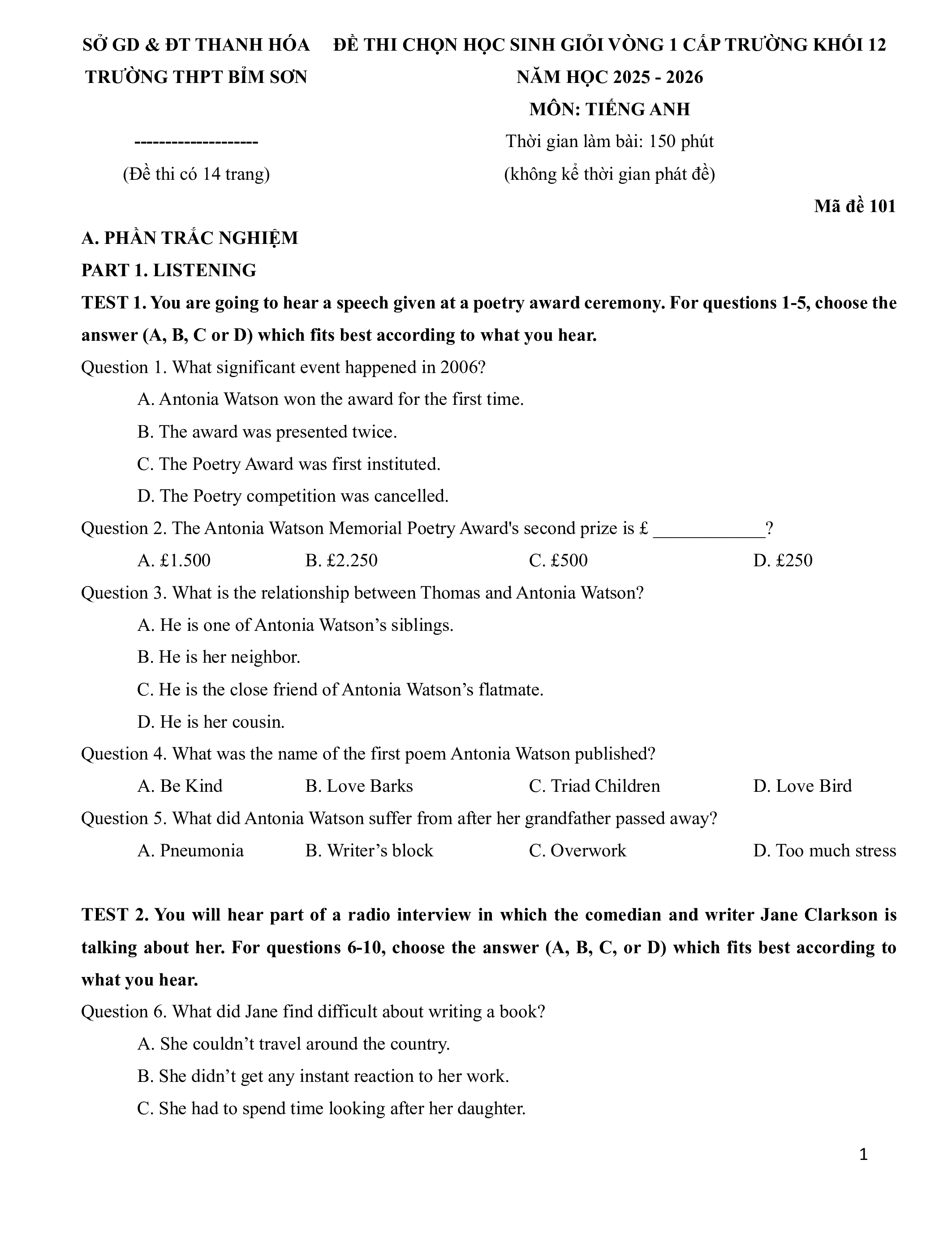 TRƯỜNG THPT BỈM SƠN NĂM HỌC 2025 - 2026 MÔN: TIẾNG ANH --------------------