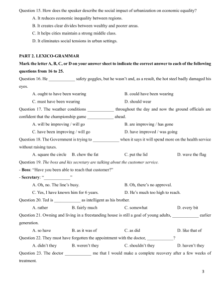 D. It eliminates social tensions in urban settings. PART 2. LEXICO-GRAMMAR