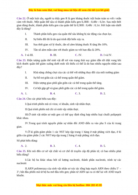 Câu 22. Ở một loài sâu, người ta thấy gen R là gen kháng thuốc trội hoàn toàn so với r mẫn