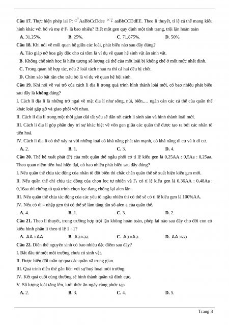 Câu 17. Thực hiện phép lai P: AaBbCcDdee aaBbCCDdEE. Theo lí thuyết, tỉ lệ cá thể mang kiểu