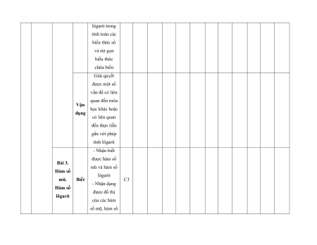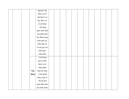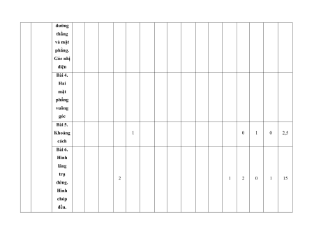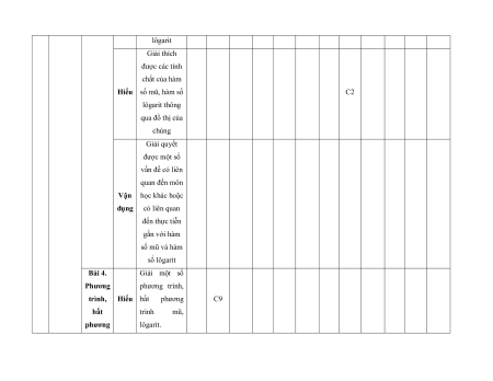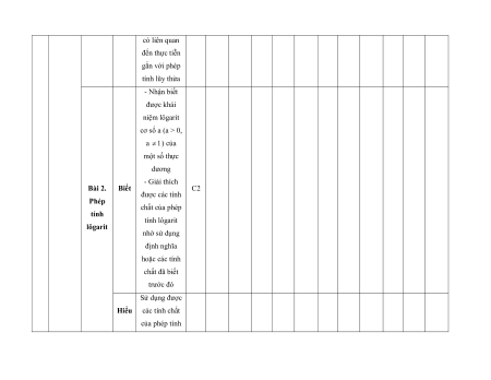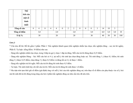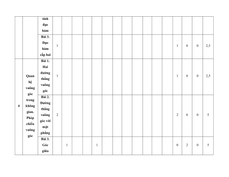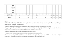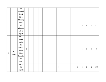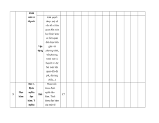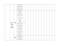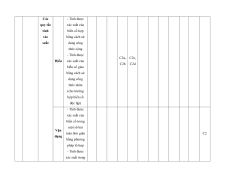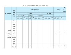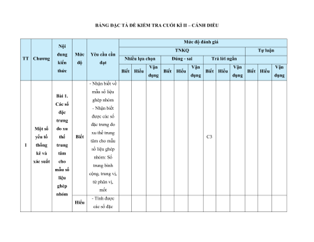 MA TRẬN ĐỀ KIỂM TRA CUỐI KÌ II – CÁNH DIỀU Tỉ Mức độ đánh giá Tổng lệ % Nội điểm dung TT Chương TNKQ Tự luận kiến Nhiều lựa chọn Đúng - sai Trả lời ngắn thức Vận Vận Vận Vận Vận Biết Hiểu Biết Hiểu Biết Hiểu Biết Hiểu Biết Hiểu dụng dụng dụng dụng dụng Bài 1. Các số đặc trưng đo xu Một số thế yếu tố trung 1 1 0 0 5 1 thống tâm kê và cho xác suất mẫu số liệu ghép nhóm Bài 2. 2 2 1 2 2 2 20 Biến cố hợp và biến cố giao. Biến cố độc lập. Các quy tắc tính xác suất Bài 1. Phép tính lũy thừa 1 1 2 0 0 7,5 với số Hàm số mũ mũ và 2 thực hàm số Bài 2. lôgarit Phép 1 1 0 0 2,5 tính lôgarit Bài 3. 1 1 1 1 0 7,5 Hàm số mũ. Hàm số lôgarit Bài 4. Phương trình, bất 1 0 1 0 2,5 phương mũ và lôgarit Bài 1. Định nghĩa đạo hàm. Ý 1 1 1 1 0 5 nghĩa Đạo 3 hình hàm học của đạo hàm Bài 2. Các 1 1 1 0 2 1 17,5 quy tắc tính đạo hàm Bài 3. Đạo 1 1 0 0 2,5 hàm cấp hai Bài 1. Hai đường Quan 1 1 0 0 2,5 thẳng hệ vuông vuông góc góc Bài 2. trong Đường 4 không thẳng gian. vuông 2 2 0 0 5 Phép góc với chiếu mặt vuông phẳng góc Bài 3. Góc 1 1 0 2 0 5 giữa