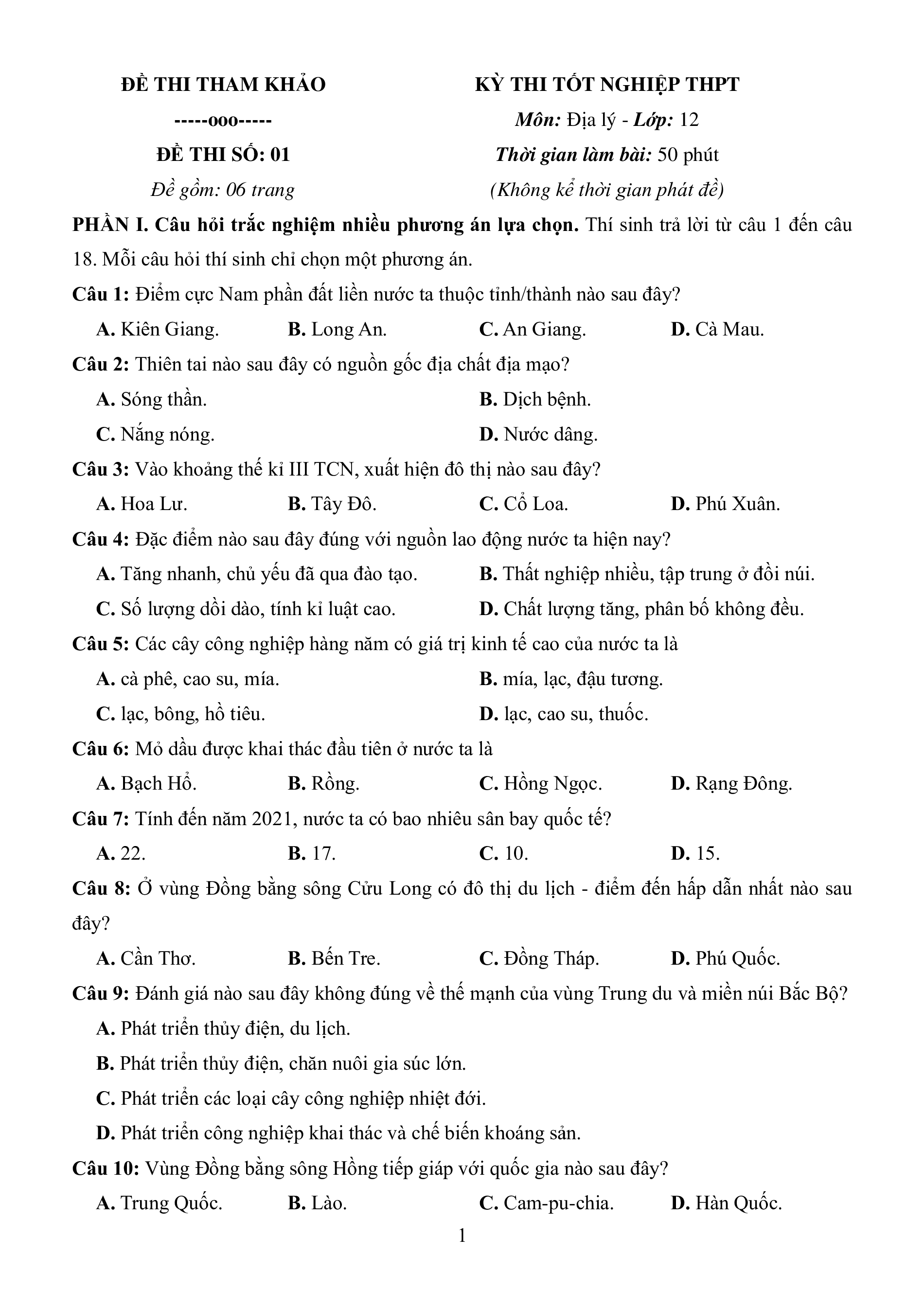 Môn: Địa lý - Lớp: 12 ĐỀ THI SỐ: 01