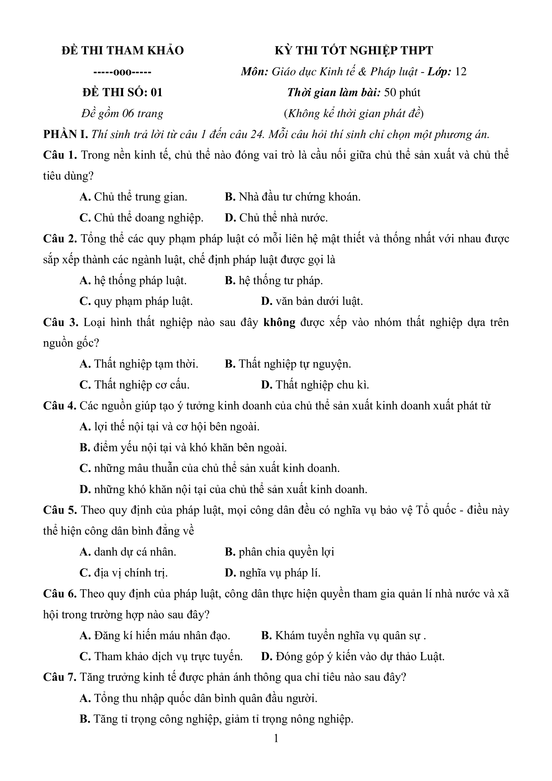 PHẦN I. Thí sinh trả lời từ câu 1 đến câu 24. Mỗi câu hỏi thí sinh chỉ chọn một phương án.