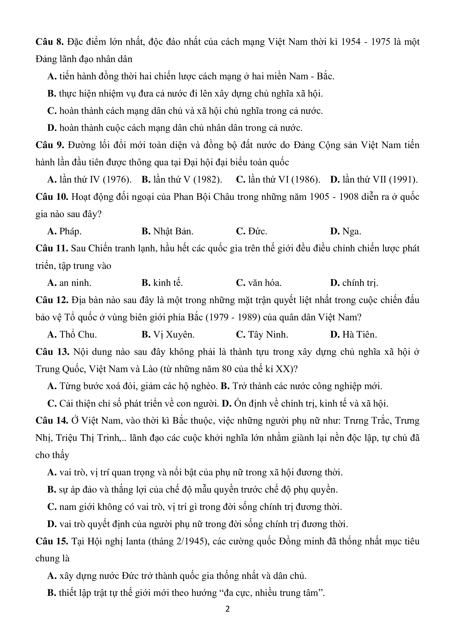 Câu 9. Đường lối đổi mới toàn diện và đồng bộ đất nước do Đảng Cộng sản Việt Nam tiến