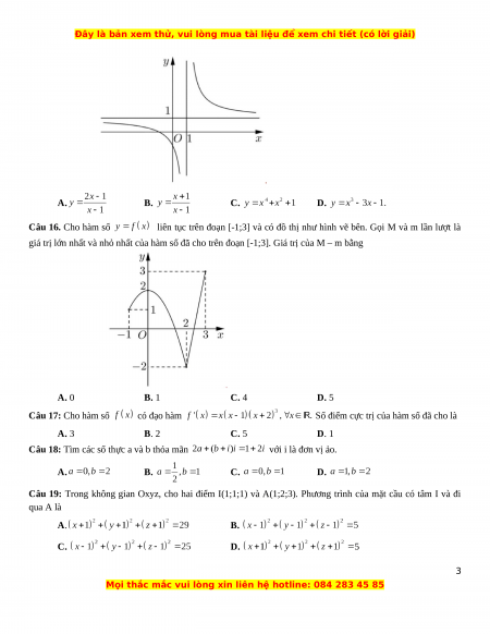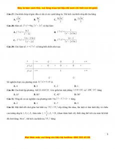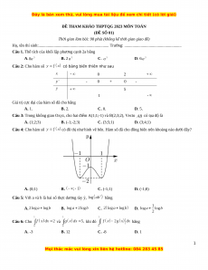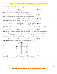 Câu 3: Trong không gian Oxyz, cho hai điểm A(1;1;-1) và B(2;3;2), Vecto có tọa độ là A. (1;2;3) B. (-1;-2;3) C. (3;5;1) D. (3;4;1) Câu 4: Cho hàm số