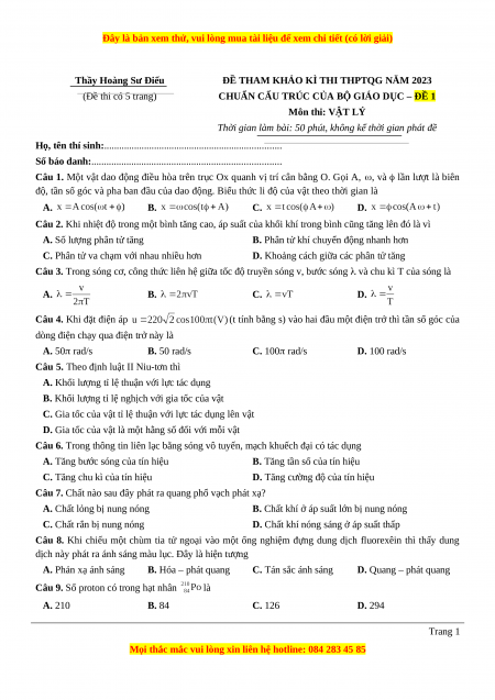 Bộ 20 đề thi Vật lí tốt nghiệp THPT năm 2023 - Hoàng Sư Điểu