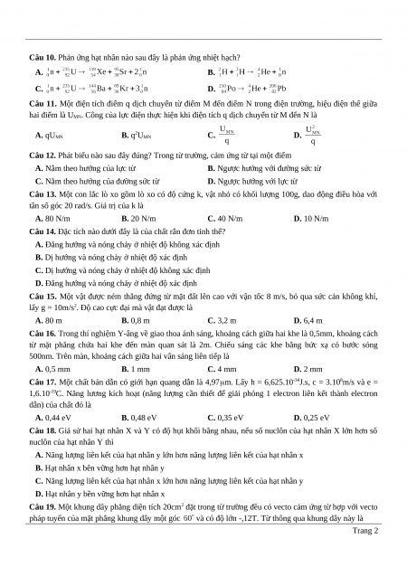 Câu 10. Phản ứng hạt nhân nào sau đây là phản ứng nhiệt hạch? A. B. C. D.