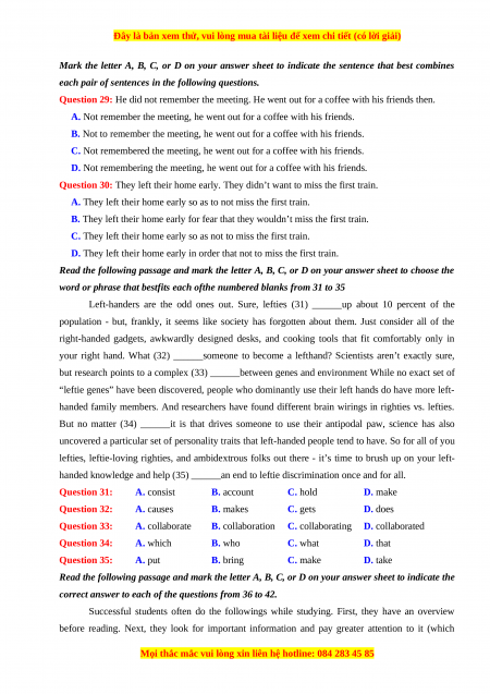 handed knowledge and help (35) ______an end to leftie discrimination once and for all. Question 31: A. consist B. account C. hold D. make Question 32: A. causes B. makes C. gets D. does Question 33: A. collaborate B. collaboration C. collaborating D. collaborated Question 34: A. which B. who C. what D. that Question 35: A. put B. bring C. make D. take