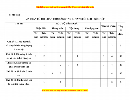 1. Khung ma trận đề kiểm tra cuối kì II môn Khoa học tự nhiên - lớp 7 a. Khung ma trận