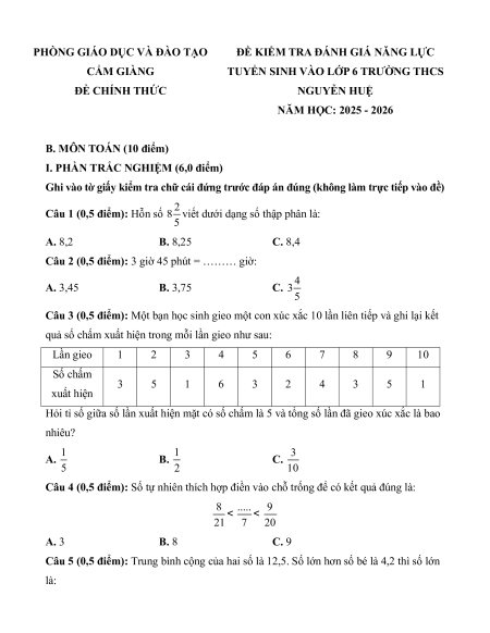 TUYỂN SINH VÀO LỚP 6 TRƯỜNG THCS ĐỀ CHÍNH THỨC NGUYỄN HUỆ NĂM HỌC: 2025 - 2026 B. MÔN TOÁN (10 điểm)