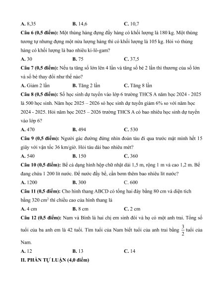 Câu 8 (0,5 điểm): Số học sinh dự tuyển vào lớp 6 trường THCS A năm học 2024 - 2025