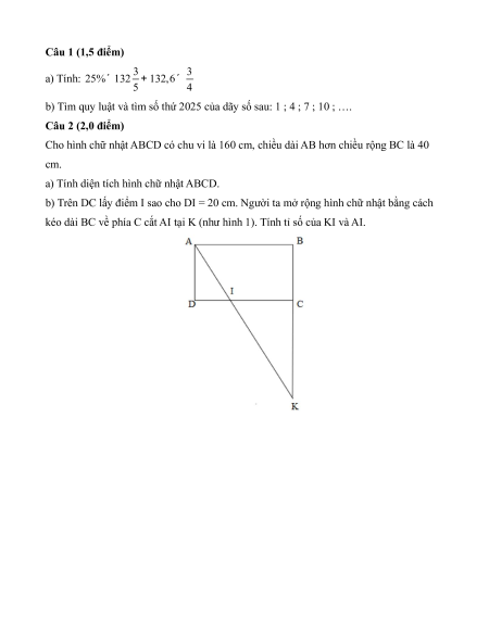 b) Tìm quy luật và tìm số thứ 2025 của dãy số sau: 1 ; 4 ; 7 ; 10 ; …. Câu 2 (2,0 điểm)