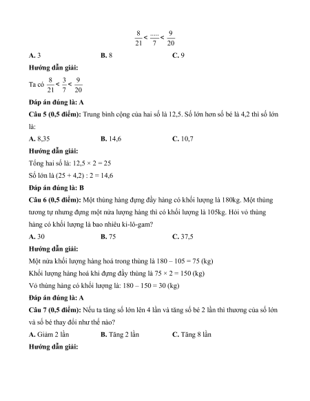 Câu 4 (0,5 điểm): Số tự nhiên thích hợp điền vào chỗ trống để có kết quả đúng là: 8 . . . 9 < < 21 7 20 A. 3 B. 8 C. 9