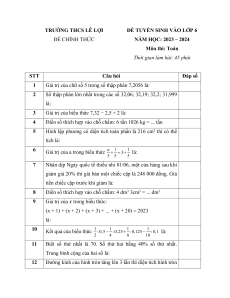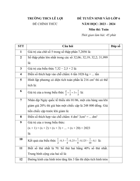 ĐỀ TUYỂN SINH VÀO LỚP 6 ĐỀ CHÍNH THỨC