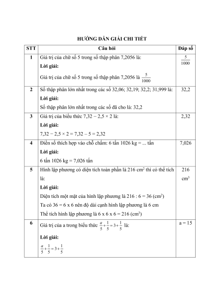 Giá trị của chữ số 5 trong số thập phân 7,2056 là: 5 Lời giải: 1000
