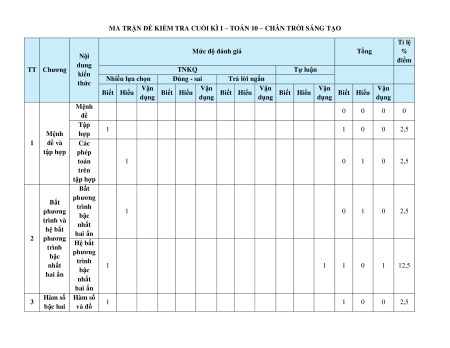 MA TRẬN ĐỀ KIỂM TRA CUỐI KÌ I – TOÁN 10 – CHÂN TRỜI SÁNG TẠO Tỉ lệ