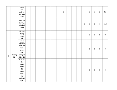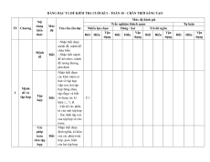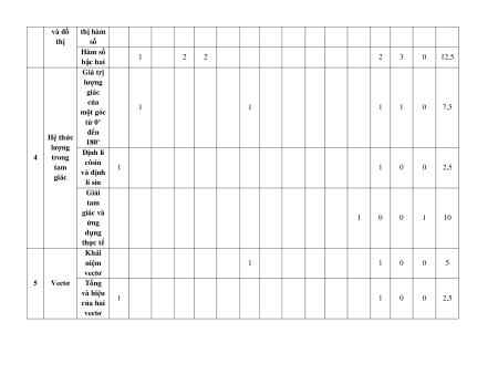 Mức độ đánh giá Tổng % Nội điểm dung TT Chương TNKQ Tự luận kiến Nhiều lựa chọn Đúng - sai Trả lời ngắn thức Vận Vận Vận Vận Vận Biết Hiểu Biết Hiểu Biết Hiểu Biết Hiểu Biết Hiểu dụng dụng dụng dụng dụng Mệnh 0 0 0 0 đề Tập 1 1 0 0 2,5 Mệnh hợp 1 đề và Các tập hợp phép toán 1 0 1 0 2,5 trên tập hợp Bất phương Bất trình phương 1 0 1 0 2,5 bậc trình và nhất hệ bất hai ẩn 2 phương Hệ bất trình phương bậc trình nhất 1 1 1 0 1 12,5 bậc hai ẩn nhất hai ẩn Hàm số Hàm số 3 1 1 0 0 2,5 bậc hai và đồ và đồ thị hàm thị số Hàm số 1 2 2 2 3 0 12,5 bậc hai Giá trị lượng giác của 1 1 1 1 0 7,5 một góc từ 0° đến Hệ thức 180° lượng Định lí 4 trong côsin tam 1 1 0 0 2,5 và định giác lí sin Giải tam giác và 1 0 0 1 10 ứng dụng thực tế Khái niệm 1 1 0 0 5 vectơ 5 Vectơ Tổng và hiệu 1 1 0 0 2,5 của hai vectơ Tích của một số 1 1 1 1 0 7,5 với một vectơ Tích vô hướng 1 1 1 0 1 12,5 của hai vectơ Số gần đúng 0 0 0 0 và sai số Mô tả và biểu diễn dữ liệu 0 0 0 0 trên các Thống bảng và 6 kê biểu đồ Các số đặc trưng đo xu thế 0 0 0 0 trung tâm của mẫu số liệu Các số đặc trưng đo độ 1 2 2 1 3 3 0 17,5 phân tán của mẫu số liệu Tổng số câu 8 4 0 4 4 0 2 2 0 0 0 3 14 10 3 Tổng số điểm 3,0 2,0 2,0 3,0 4,0 3,0 3,0 10 Tỉ lệ % 30 20 20 30 40 30 30 100 Lưu ý: