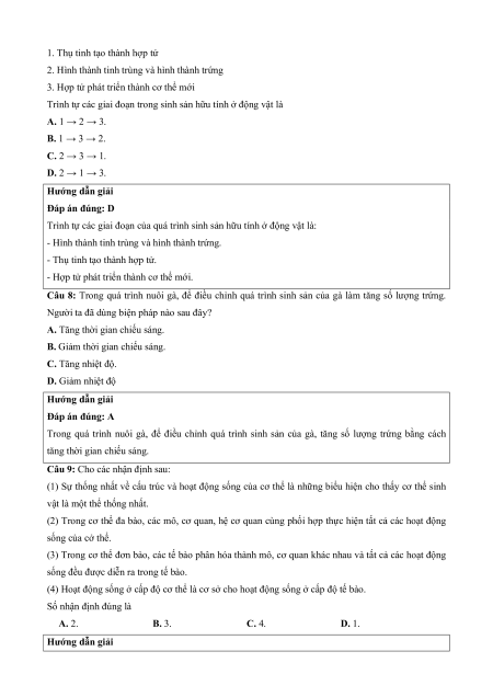 Câu 8: Trong quá trình nuôi gà, để điều chỉnh quá trình sinh sản của gà làm tăng số lượng trứng.