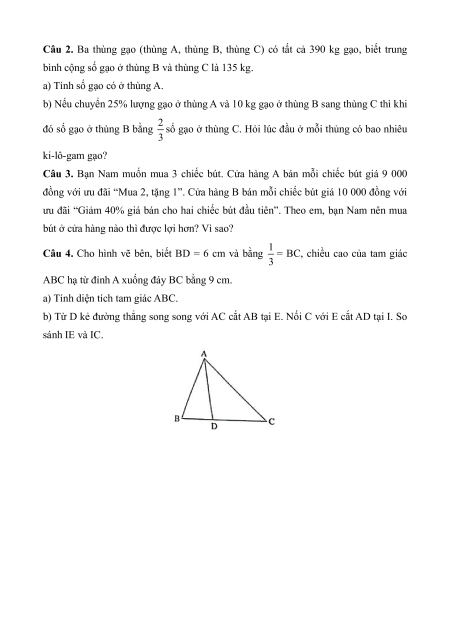 Câu 2. Ba thùng gạo (thùng A, thùng B, thùng C) có tất cả 390 kg gạo, biết trung