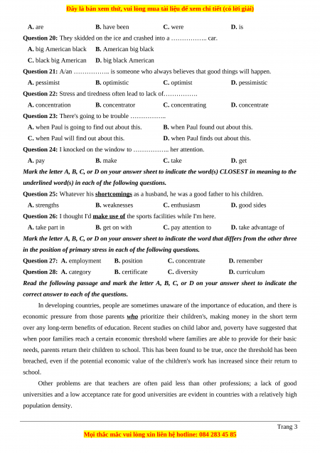 Question 20: They skidded on the ice and crashed into a …………….. car. A. big American black B. American big black C. black big American D. big black American