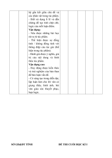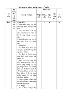 BANG ĐĂC TA ĐỀ KIỂM TRA CUỐI KÌ I Nội Sô câu hoi dung/ Kĩ Đơn Vận năng vị Mức độ đánh giá Nhận Thông Vận Tỉ dụng kiến biết hiểu dụng lệ % cao thức Đọc Văn Nhận biết: 2 2 1 40 bản