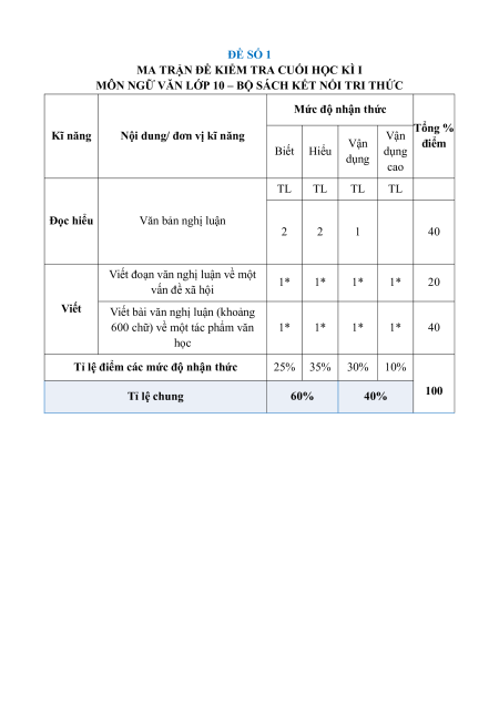 Tỉ lệ điểm các mức độ nhận thức 25% 35% 30% 10% 100 Tỉ lệ chung 60% 40%