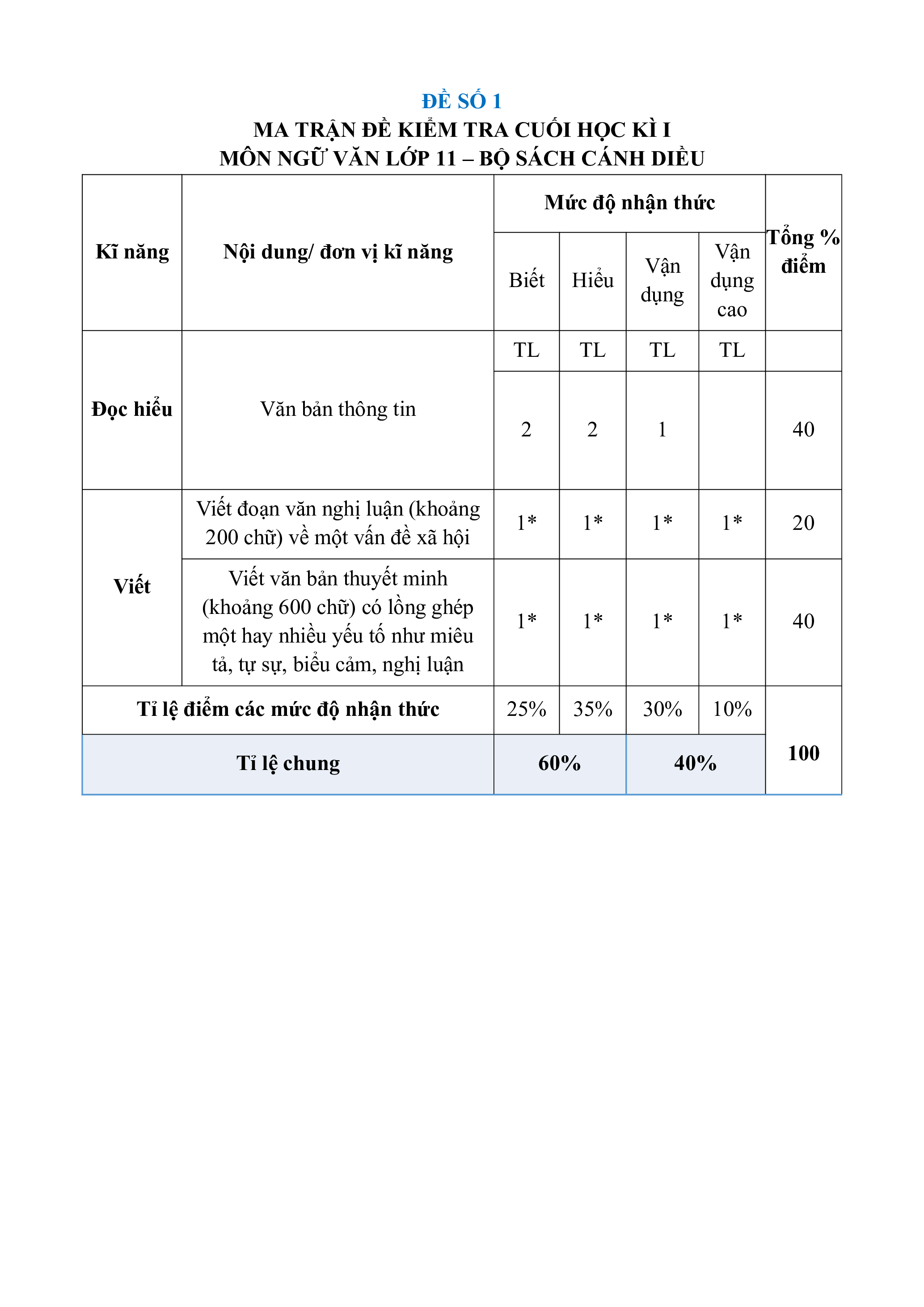 - Tailieugiaovien.com.vn giới thiệu bộ 25 đề cuối kì 1 gồm đầy đủ ma trận và lời giải chi tiết môn Ngữ văn 11 Cánh diều Cấu trúc mới nhằm giúp Giáo viên có thêm tài liệu tham khảo ra đề thi Ngữ văn lớp 11.