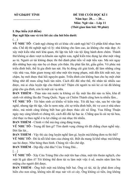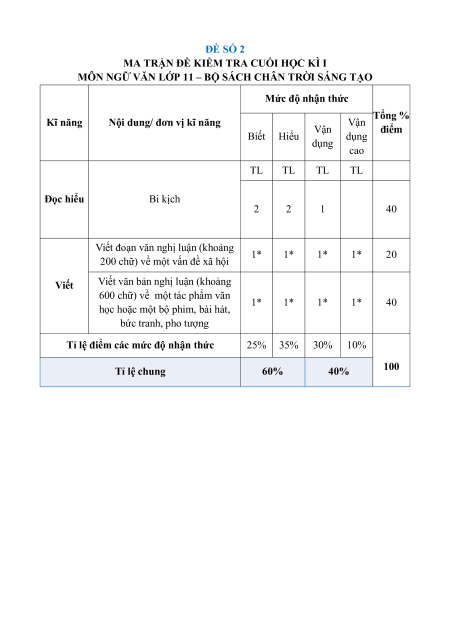 - Tailieugiaovien.com.vn giới thiệu bộ 25 đề cuối kì 1 gồm đầy đủ ma trận và lời giải chi tiết môn Ngữ văn 11 Chân trời sáng tạo Cấu trúc mới nhằm giúp Giáo viên có thêm tài liệu tham khảo ra đề thi Ngữ văn lớp 11.