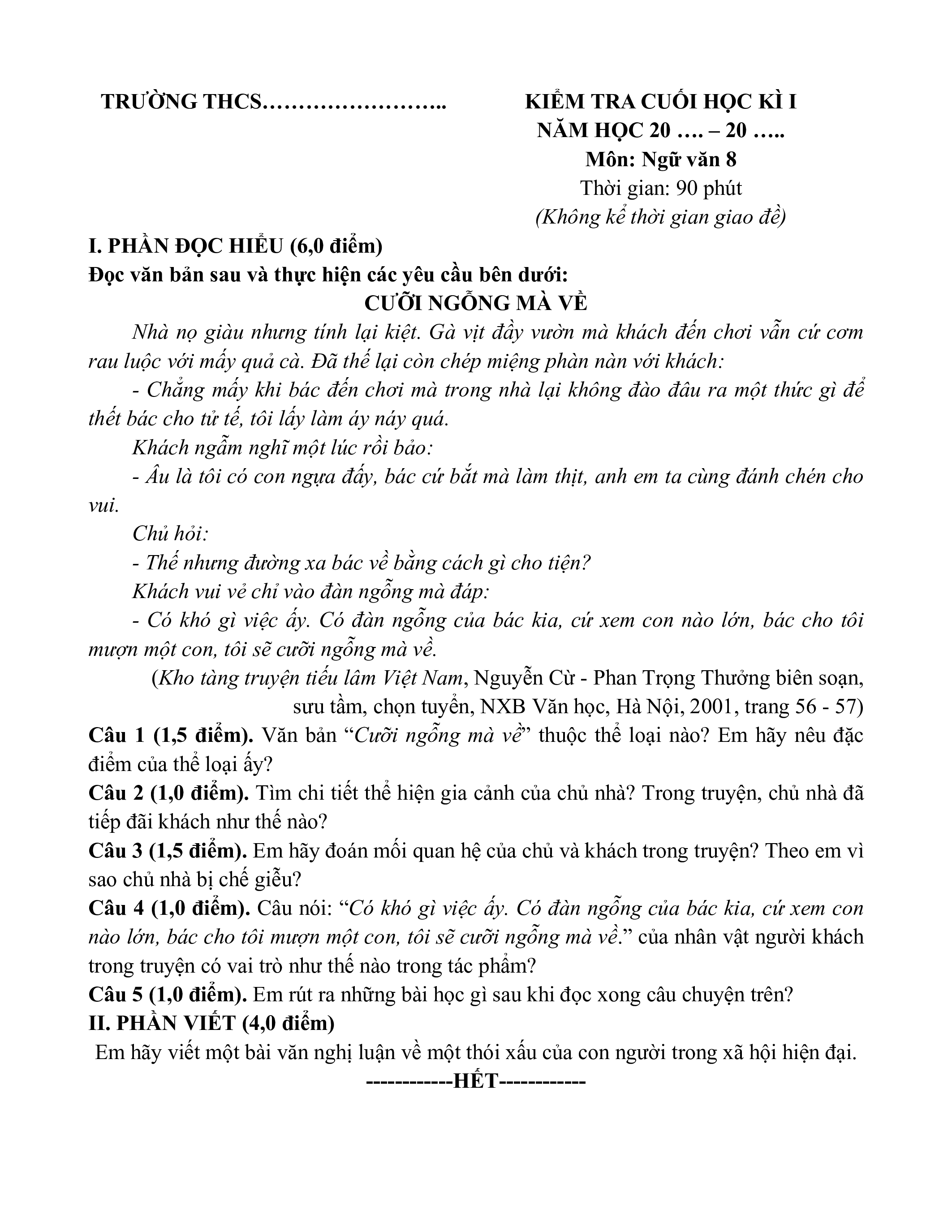 NĂM HỌC 20 …. – 20 …. Môn: Ngữ văn 8 Thời gian: 90 phút