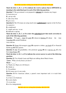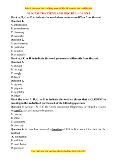 Mark A, B, C or D to indicate the word whose main stress differs from the rest. Question 1. A. information B. entertainment C. discovery D. scientific Question 2. A. environment B. particular C. situation D. expectedly