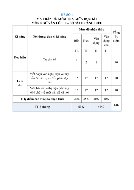 Tỉ lệ điểm các mức độ nhận thức 25% 35% 30% 10% 100 Tỉ lệ chung 60% 40%