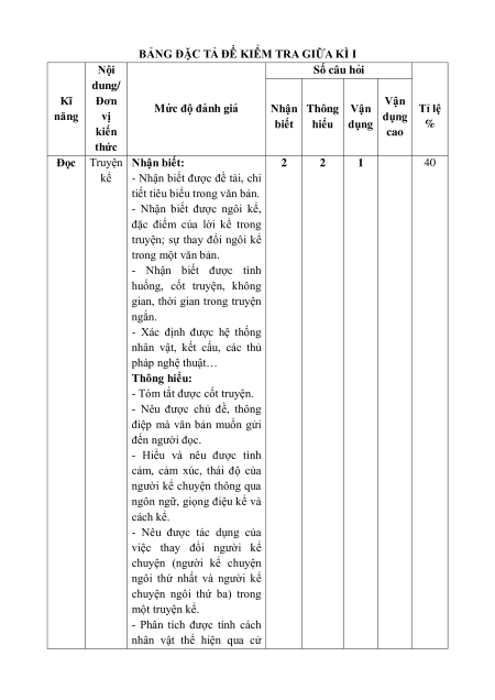 MA TRẬN ĐỀ KIỂM TRA GIỮA HỌC KÌ I