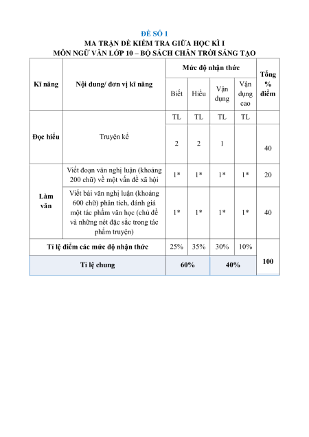 Tỉ lệ điểm các mức độ nhận thức 25% 35% 30% 10% 100 Tỉ lệ chung 60% 40%