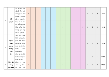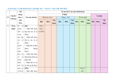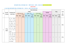 Chủ đề/ Nội dung/ đơn Tự luận TT Nhiều lựa chọn “Đúng – Sai” Trả lời ngắn % Chương vị kiến thức Vận Vận Vận Vận Vận điểm Biết Hiểu Biết Hiểu Biết Hiểu Biết Hiểu Biết Hiểu dụng dụng dụng dụng dụng Số tự nhiên. Thứ tự trong tập hợp các số tự nhiên. Các phép tính với số 2 1 2 1 0 10% tự nhiên. Phép tính luỹ thừa Số tự 1 với số mũ tự nhiên nhiên Tính chia hết trong tập hợp các số tự nhiên. 1 1 1 1 1 1 15% Số nguyên tố. Ước chung và bội chung. Số nguyên âm và tập hợp các số nguyên. Thứ 2 3 1 5 1 0 15% tự trong tập hợp Số các số nguyên. 2
