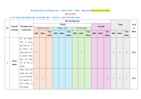 A. MA TRẬN ĐỀ KIỂM TRA CUỐI HỌC KÌ 1 – TOÁN 6 – KẾT NỐI TRI THỨC