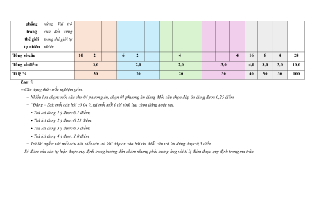 tự nhiên nhiên Tổng số câu 10 2 6 2 4 4 16 8 4 28 Tổng số điểm 3,0 2,0 2,0 3,0 4,0 3,0 3,0 10,0 Tỉ lệ % 30 20 20 30 40 30 30 100 Lưu ý:
