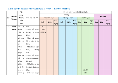 B. BẢN ĐẶC TẢ ĐỀ KIỂM TRA CUỐI HỌC KÌ 1 – TOÁN 6 – KẾT NỐI TRI THỨC Nội