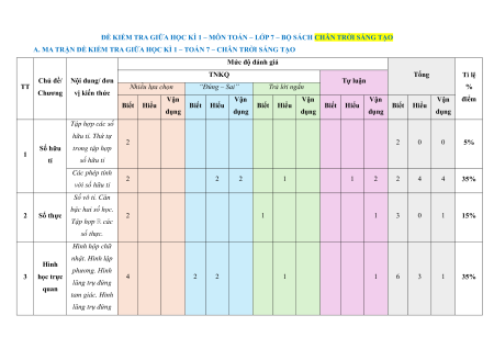 A. MA TRẬN ĐỀ KIỂM TRA GIỮA HỌC KÌ 1 – TOÁN 7 – CHÂN TRỜI SÁNG TẠO