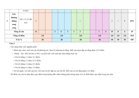 Đường Góc ở vị trí đặc 3 thẳng 2 1 2 1 0 10% biệt. song song Tổng số câu 12 2 4 2 1 3 1 4 15 8 6 29 Tổng số điểm 3,0 2,0 2,0 3,0 4,0 3,0 3,0 10,0 Tỉ lệ % 30 20 20 30 40 30 30 100 Lưu ý: